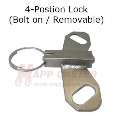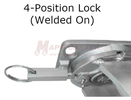 4-Position Swivel Lock: This allows you to turn a swivel caster into a rigid caster. When the pin is released into one of the 4 slots located 90 degrees apart, it locks the swivel section in place. Both a welded on option and a field installable bolt on option are available.Â