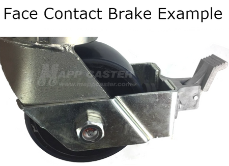 Face Contact Brake:Â Designed for heavy duty casters, this brake can be activated be either foot or hand. The brake pad presses on the face of the wheel to prevent the wheel from spinning.
